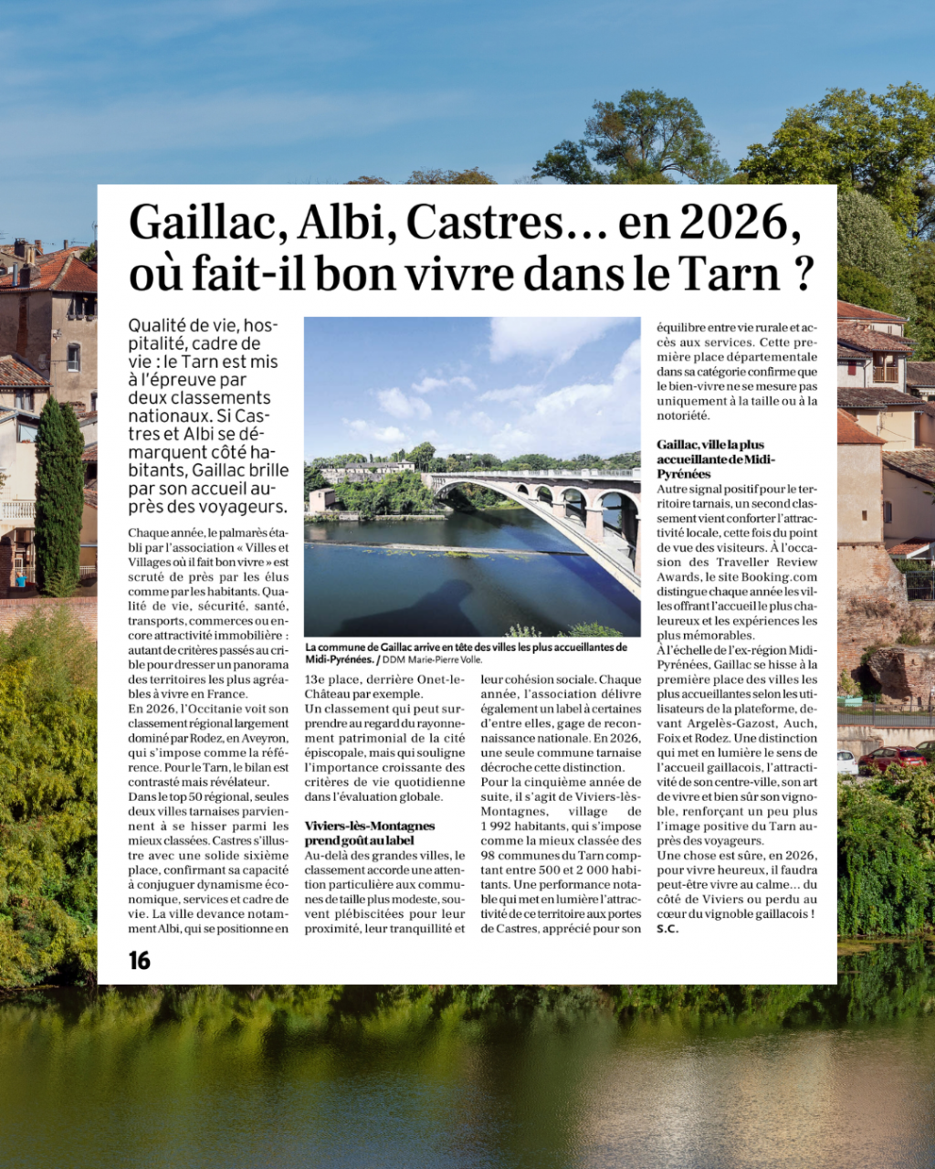 Qualité de vie, hospitalité, cadre de vie : le Tarn a récemment été passé au crible par deux classements nationaux. Si Castres et Albi se démarquent principalement du côté des habitants, Gaillac tire clairement son épingle du jeu pour l’accueil réservé aux voyageurs. À l’occasion des Traveller Review Awards, la plateforme Booking.com distingue chaque année les destinations offrant l’accueil le plus chaleureux et les expériences les plus mémorables, sur la base des avis laissés par ses utilisateurs.
