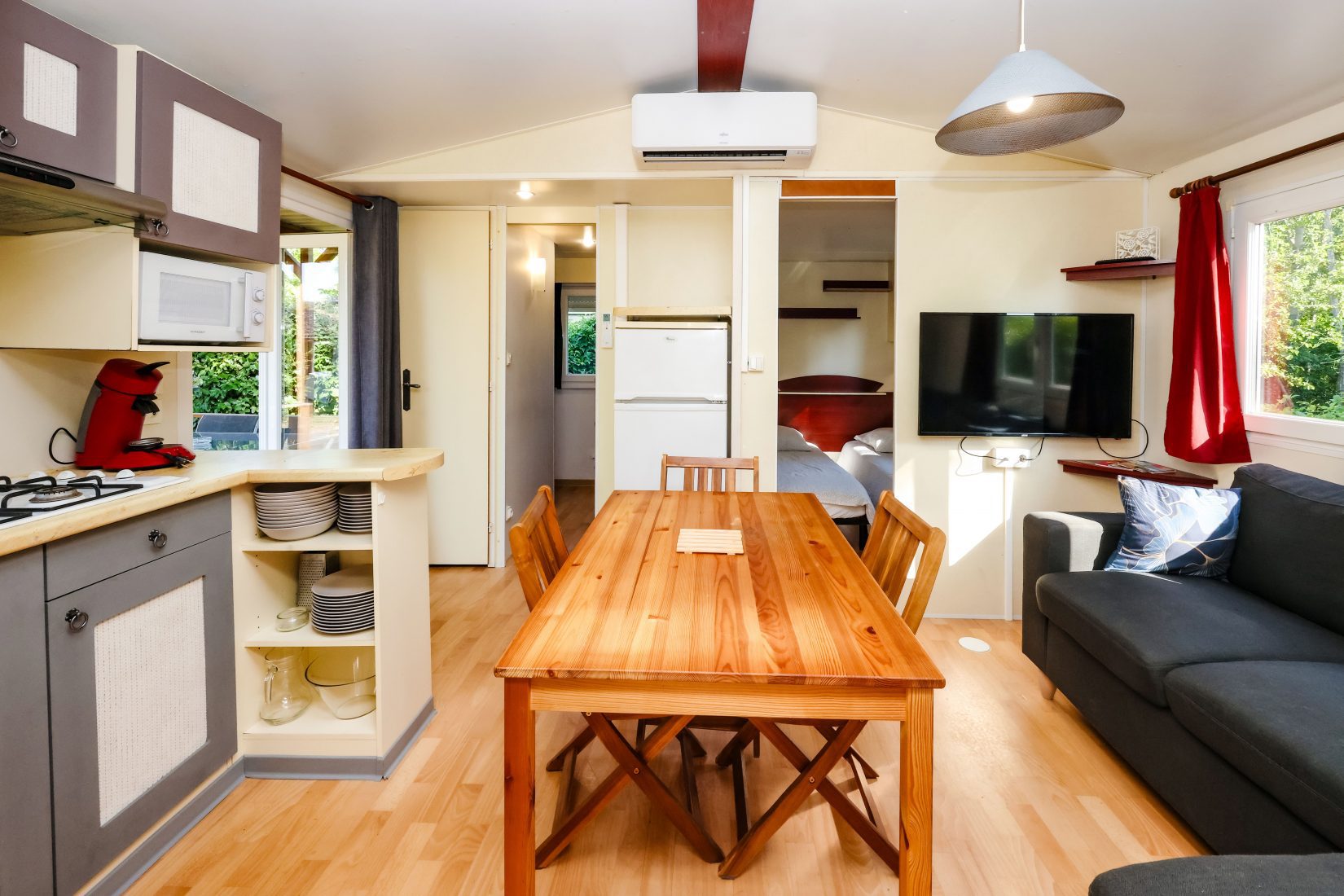 À l’intérieur, le mobil-home est entièrement équipé pour que vous vous sentiez comme à la maison :